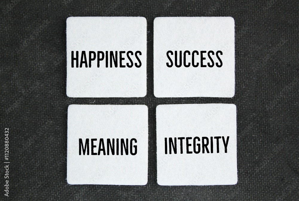 white square with the words Happiness, success, meaning, and integrity. What are the 4 main goals in life? the concept of the best life goals