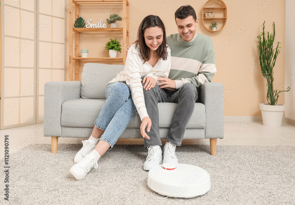 Modern robot vacuum cleaner cleaning carpet near relaxing couple on sofa