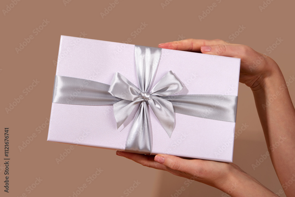 Womans hands holding a white gift box adorned with a silver ribbon bow against a rich brown background, symbolizing celebration, surprise, and special occasions Mocha Mousse color of 2025 year