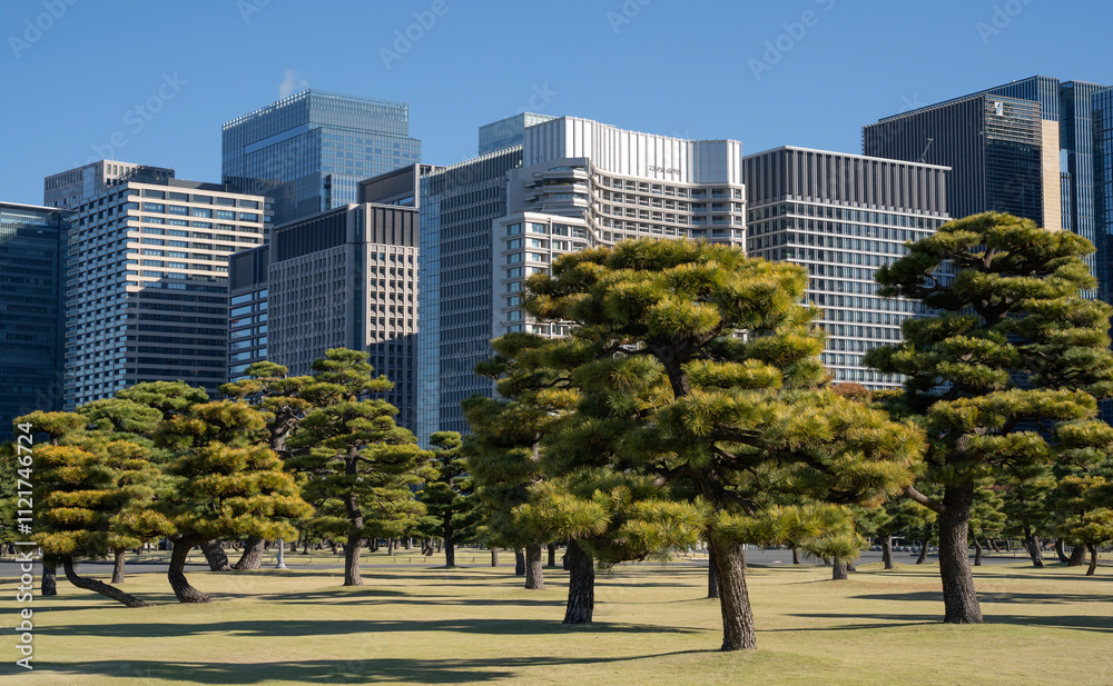 Pine trees in outer garden Imperial Palace with high building skyscrapers background, Tokyo, Japan.