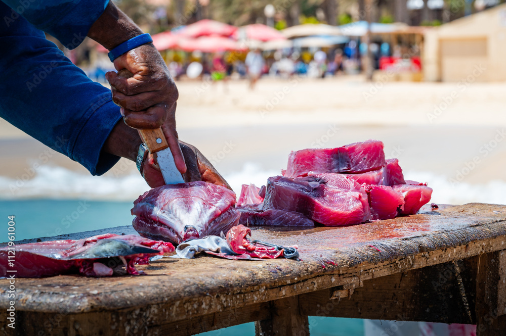 Close up on fisherman's hands, cutting tuna, its fresh catch in fillet directly on the pier, Cape Verde