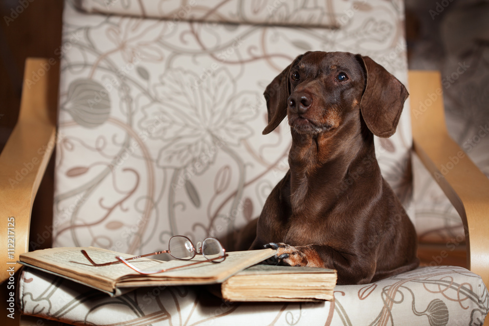 Такса лежит в кресле с книгами