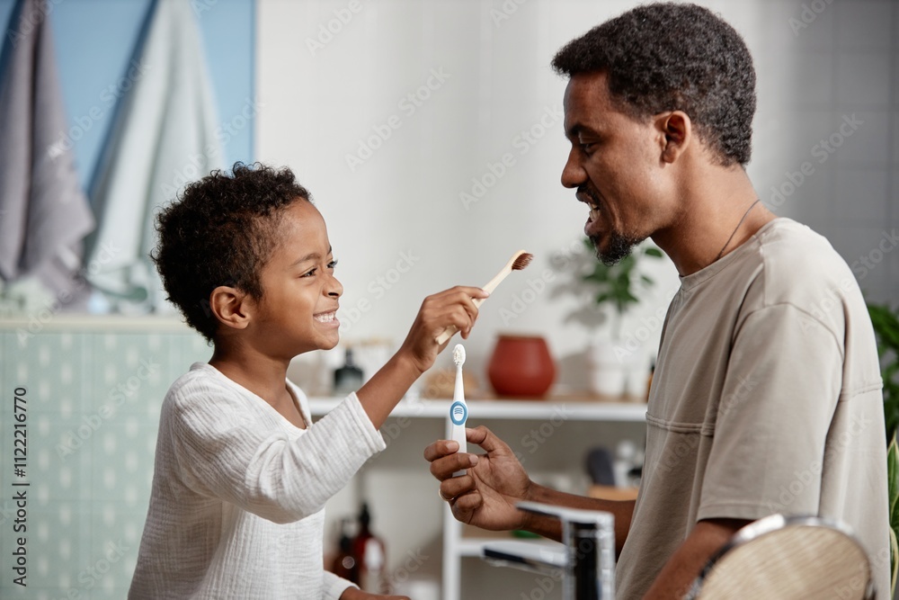 Smiling Black Boy Brushing Fathers Teeth with Toothbrush in Bathroom