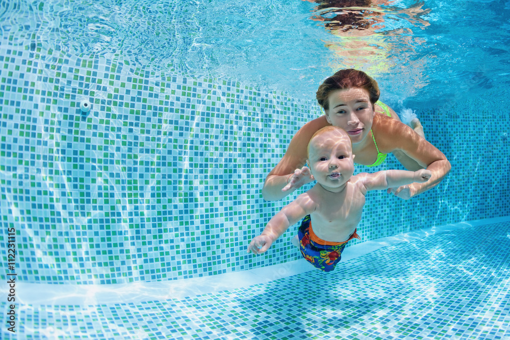 Child swimming lesson - baby with mother learn to swim, dive underwater in swimming pool. Healthy active family lifestyle, physical exercise, water sport activity, fun with parents on summer vacation.