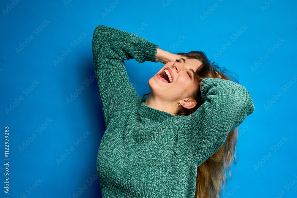 Young woman laughing with hands on head, wearing green sweater on blue background