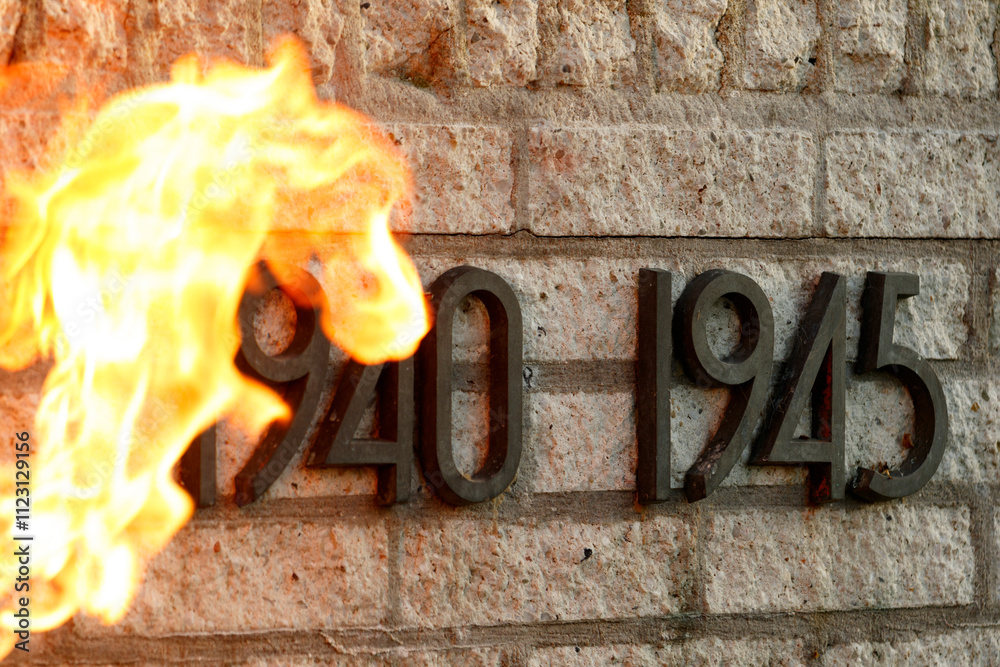 Flames burn above the dates 1940 and 1945, etched into a stone wall. A memorial?