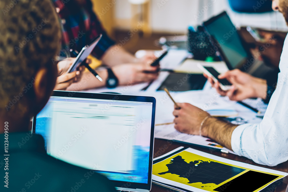 Diverse group of creative male and female designers communicating with each other about and talking about cooperative process during briefing in office sitting at meeting table with laptop computer