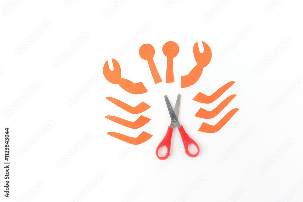 step in creative process, an arrangement of orange paper cutouts on a white background. resemble a stylized crab. large claw shapes at the top, context of art or design. scissors