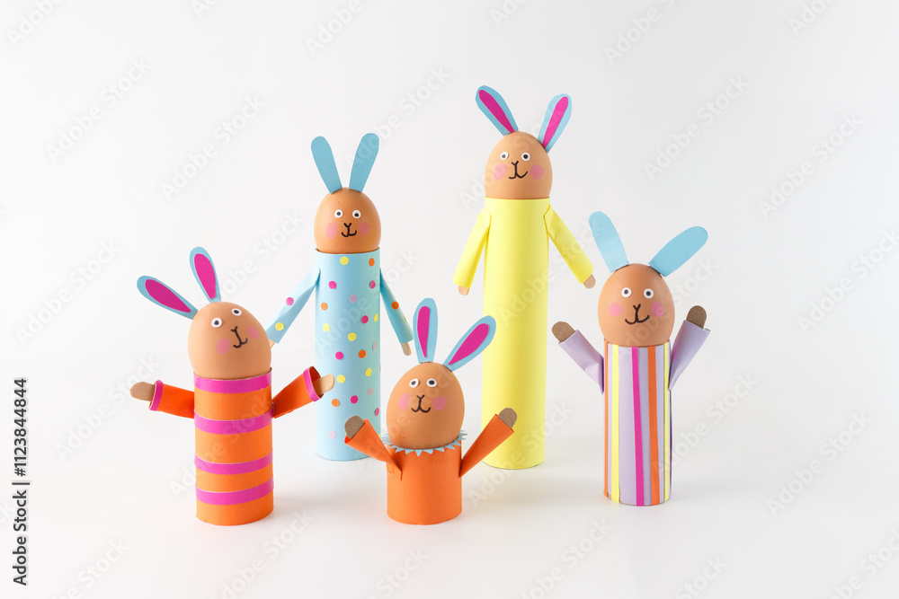bunnies are arranged in a group, standing on a white surface against a plain background,