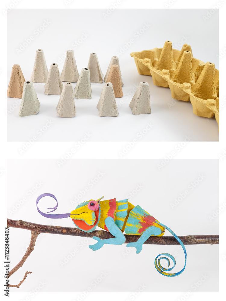 Recycled materials Chameleon craft, egg cartons, cardboard, step-by-step guide, eco-friendly, DIY project, educational, fun for children, creative, sustainable, vibrant colors,