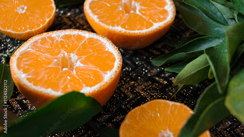 Tangerines on a branch, on a black and gold background, juicy tangerines on a shiny background, fruits on the table, side view, citrus fruits, citrus season, Italy