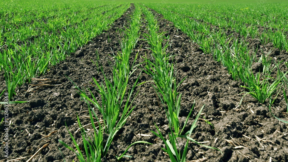 Wheat Crop In Spring Season. Stalks Wheat Fluttering In Wind. Beautiful Green Wheat Field In Countryside. Green Grass On Field. Wheat Field. Growth Time Green Plant.