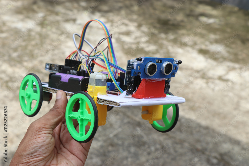 Robotic car built at home using programmable controller that follows human held in the hand that uses infrared and ultrasonic sensor