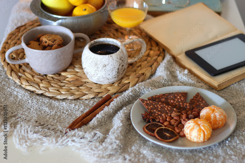 Books, e-reader, tea, orange juice, fruit, snacks, yarn, blanket and lit candles on the table. Autumn or winter hygge at home. Selective focus.