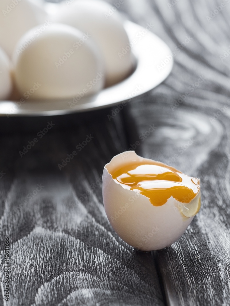 fresh raw white eggs in metal plate on wooden table and one broken egg with two yolks