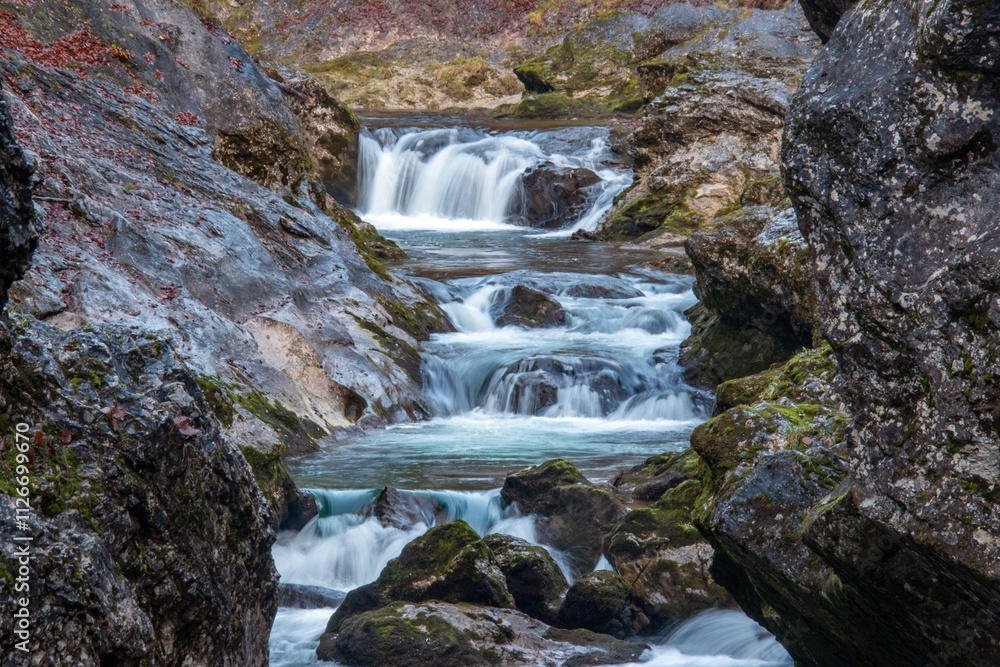 A stream and waterfall in the Walchenklamm gorge in the Bavarian Forest in late autumn. Rocks covered in moss and trees without leaves. mysterious and enigmatic.