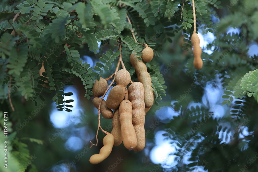 Sweet tamarind and leaf on the organic trees. Raw tamarind fruit hang on the tamarind tree in the garden with natural background. Fresh and colorful fruits that is high in vitamin C.