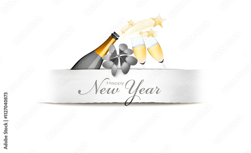 Neujahrskarte 2025 mit Banderole und Sektgläser