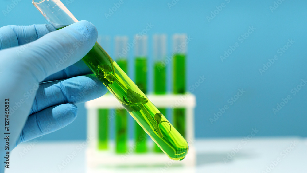 Biotechnology lab. Plant sprout in a test tube. Scientific laboratory and bioengineering