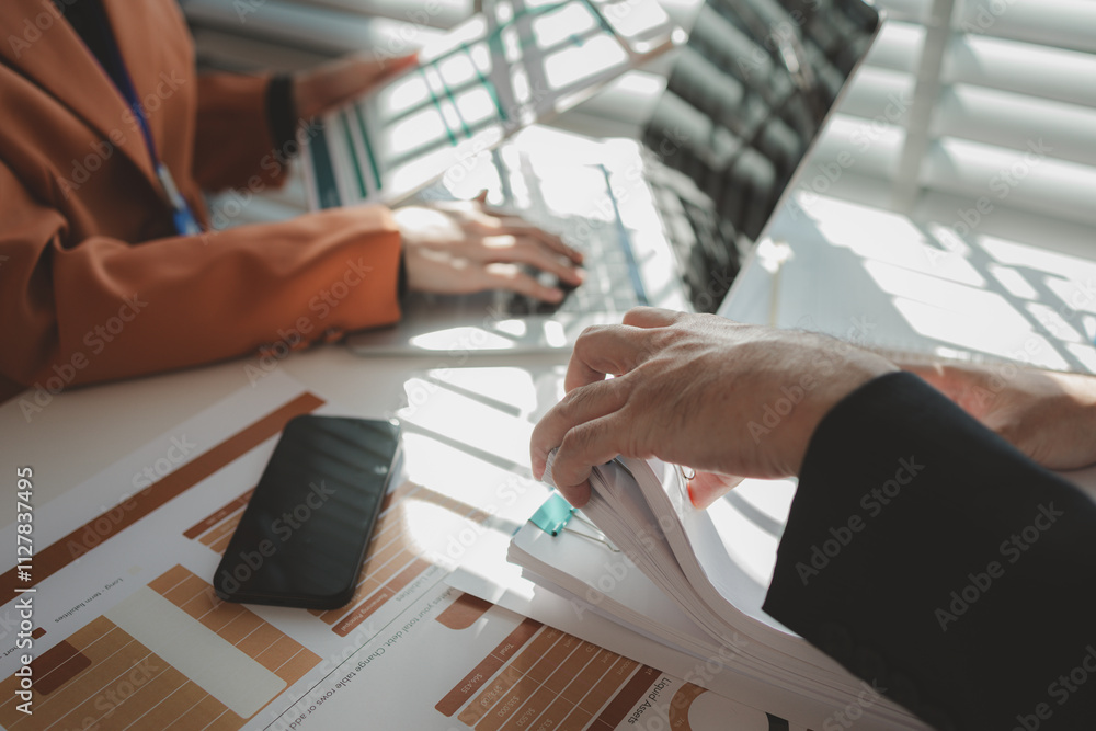 employees sit in an office with a pile of documents that need to be completed before work ends, entrepreneurs are planning their work to prepare for presentation to investors
