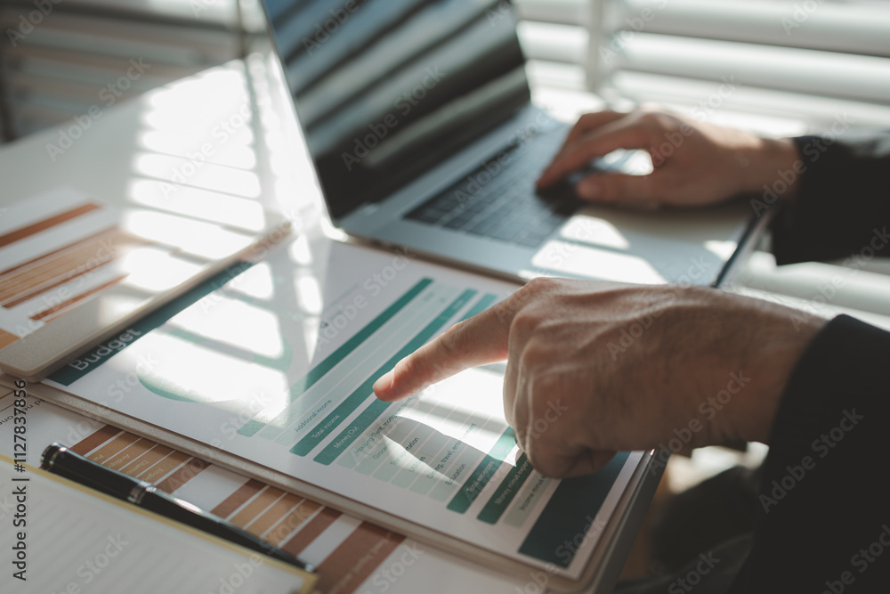 working atmosphere in an office during the day, an employee is sitting at his desk working with his colleagues around him, entrepreneurs work with documents in the company
