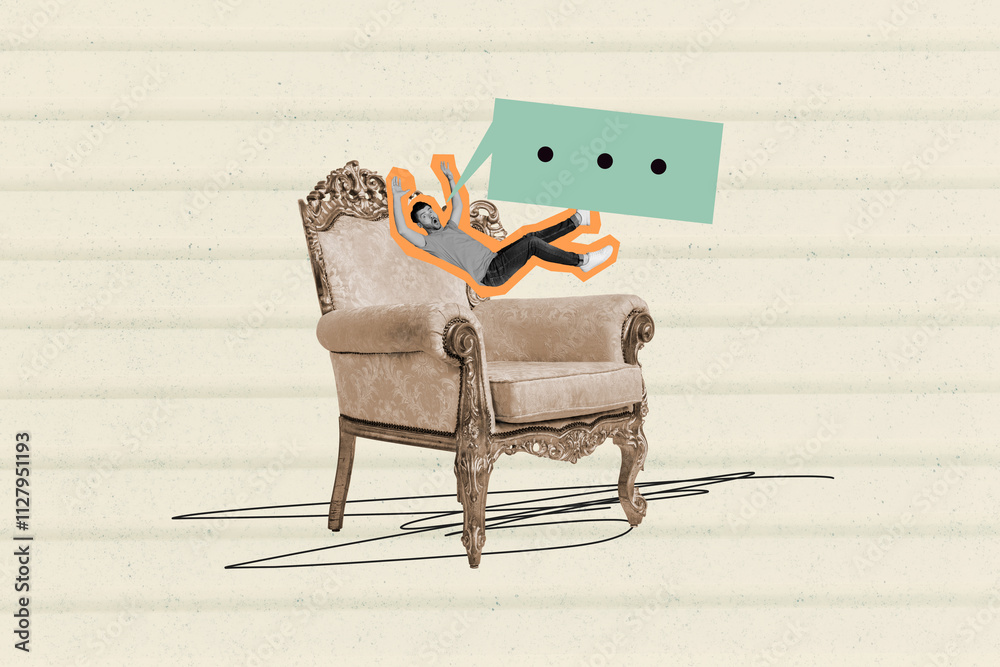 Composite photo collage of astonished man fall royal armchair bubble communication speech talk phrase isolated on painted background