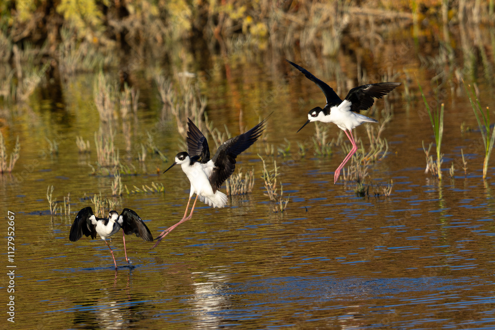 Black-necked stilt landing in beautiful light, seen in a North California marsh
