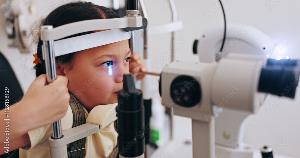 Machine, doctor or kid in eye exam at optometry clinic for eyewear, retina health or sight wellness. Optical equipment, mature or child in assessment for visual help, vision test or spectacles frames
