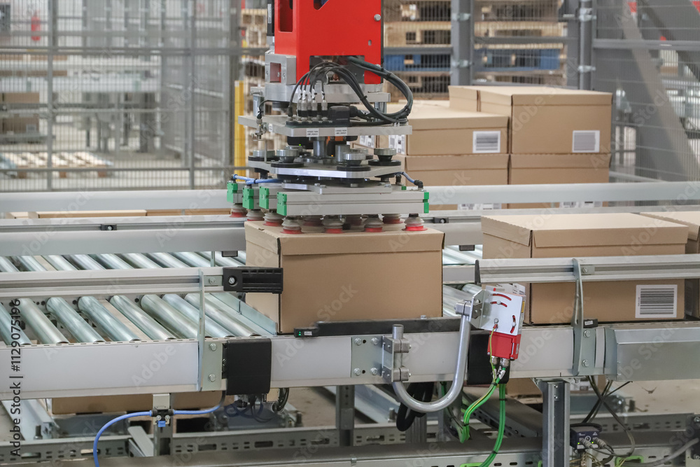palletizer - packing line in a logistics warehouse. conveyor belt in a modern production line