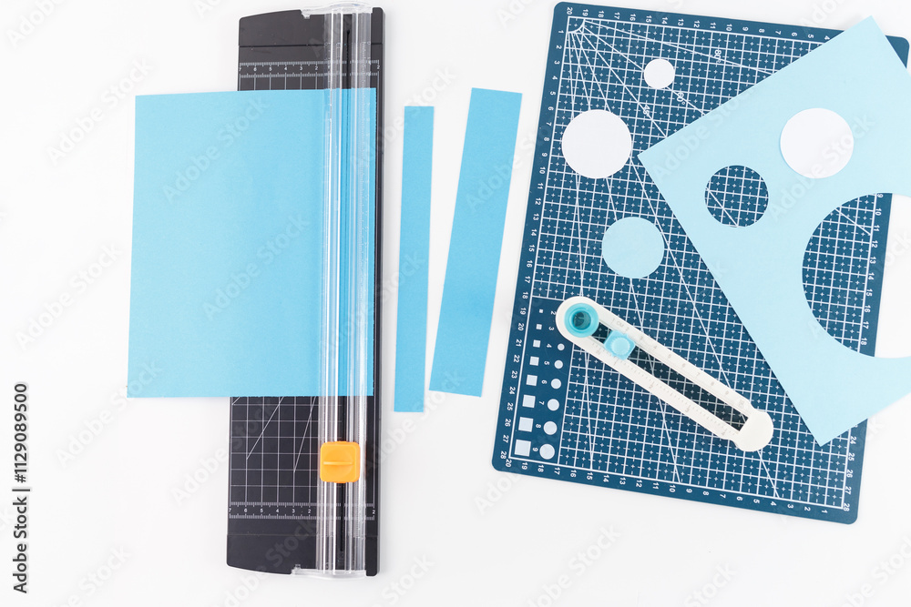 crafting tools and materials used for cutting circles and paper strips. cutting mat with a grid and various, several cut-out circles of different sizes scattered around.