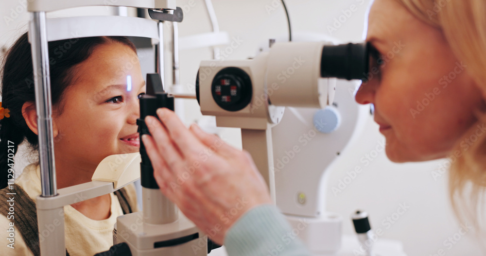 Doctor, child and examination with slit lamp for retina assessment, eye care corneal injury. Pediatric, specialist and girl patient with medical instrument for glaucoma exam and eyesight wellness