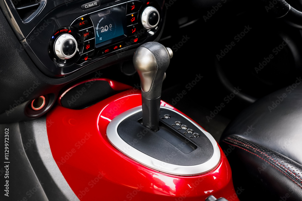 automatic transmission shift selector in the car interior. Closeup a manual shift of modern car gear shifter. 4x4 gear shift