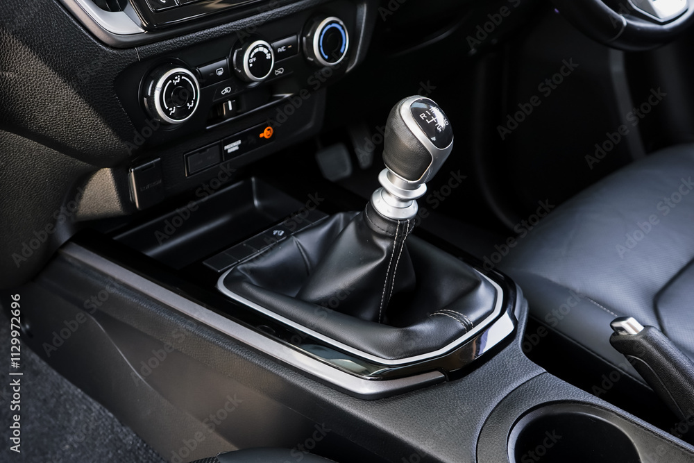 automatic transmission shift selector in the car interior. Closeup a manual shift of modern car gear shifter. 4x4 gear shift