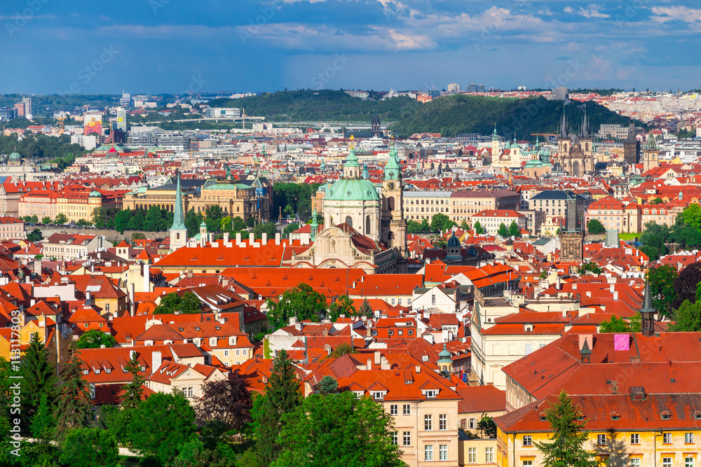 Terracotta red roofs of the city Prague shot from the high point, Prague, Czech Republic