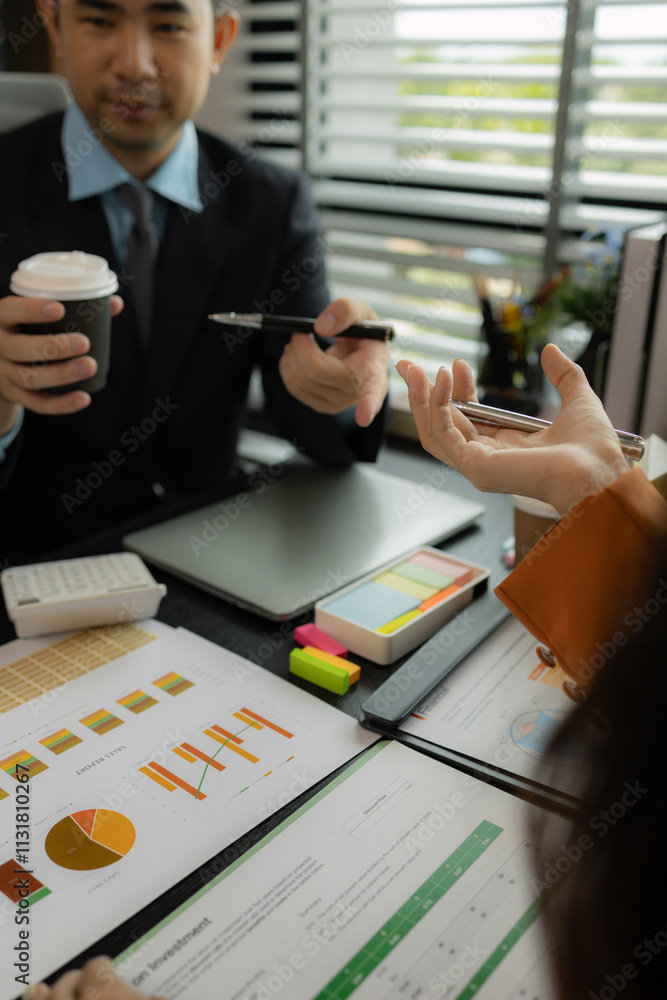 a group of businessman is meeting in the office in the morning with their coffee, colleagues sit together having some coffee in the workplace, businesspeople discussion about their new project
