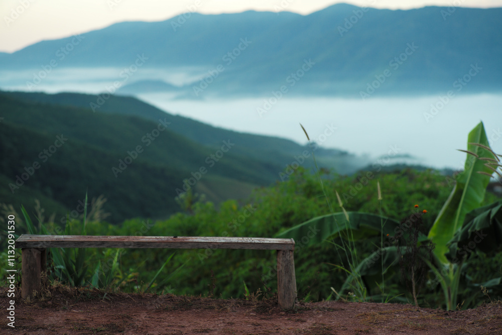The empty wooden bench on the mountain with the view of mountain layers and fluffy white fog in background