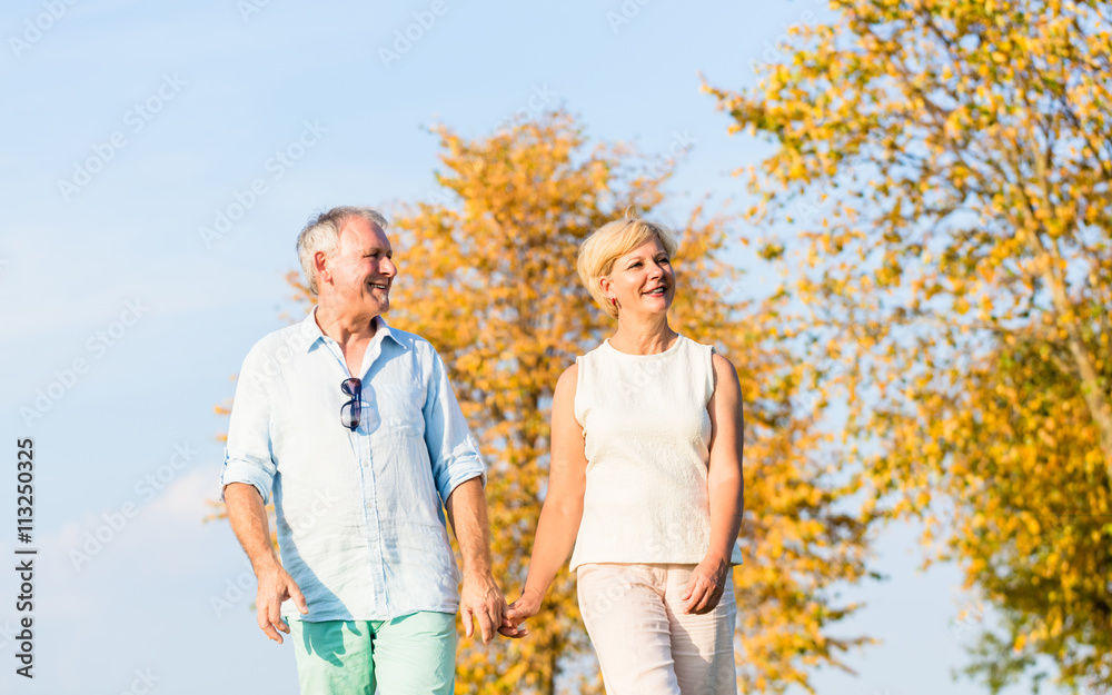 Senior Paar, Frau und Mann, beim Spaziergang über eine Wiese