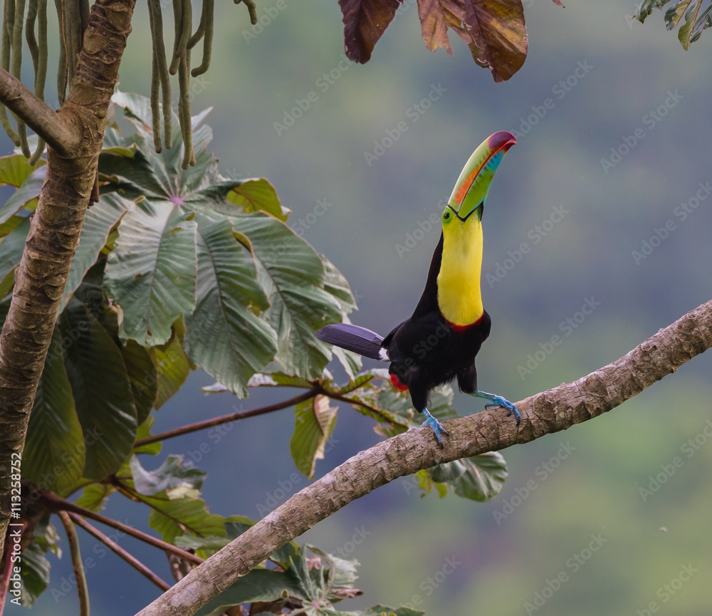 Streeeeetch...A beautiful Keel-billed Toucan in a tree near our home in rural Costa Rica. Photographed live in the jungle Cloud Forest.