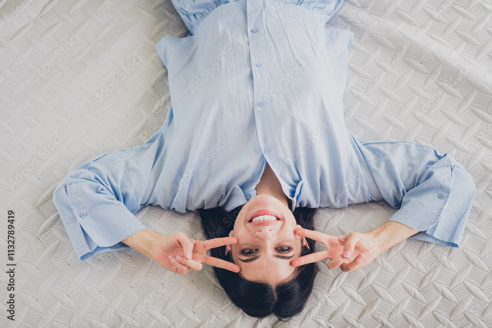 Charming young woman smiling and relaxing on bed in blue sleepwear during a bright morning at home