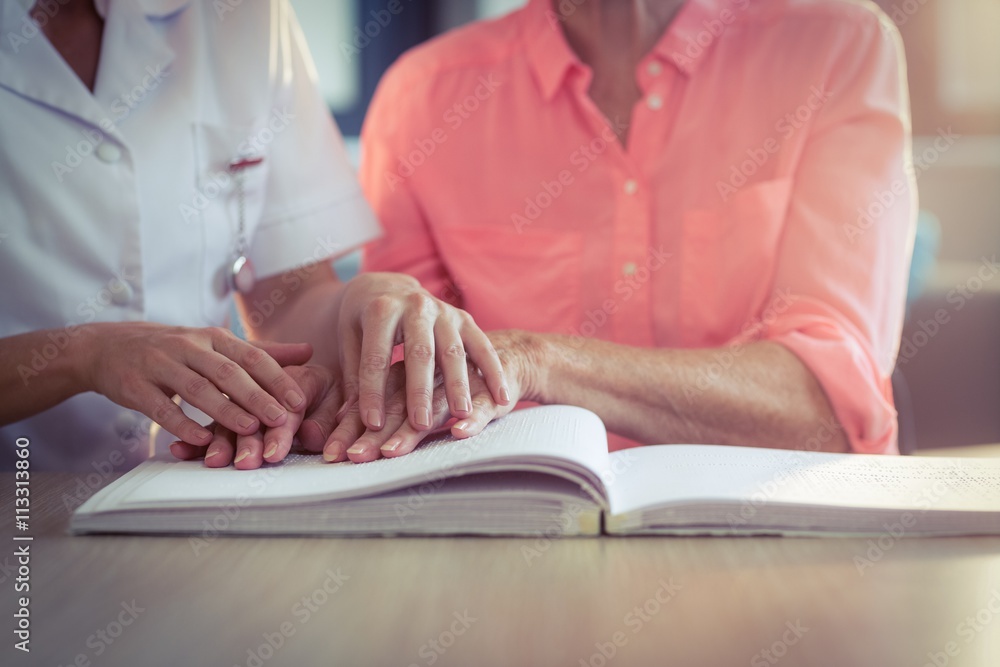 Female nurse helping patient reading the braille book
