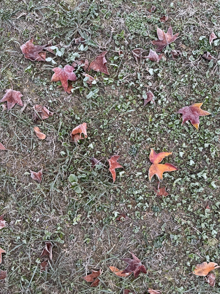 Autumn leaves with frozen grass
