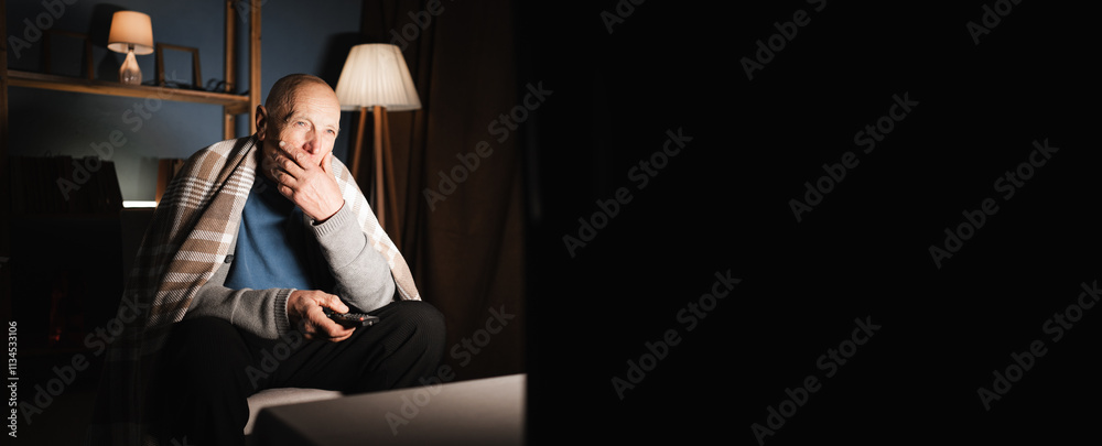 Elderly man watching TV at night holding remote control looking thoughtfully at screen with serious expression
