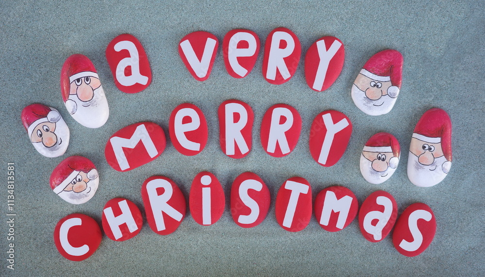 A Very Merry Christmas, creative message composed with hand painted red colored stone letters and stone Santa Claus over green sand