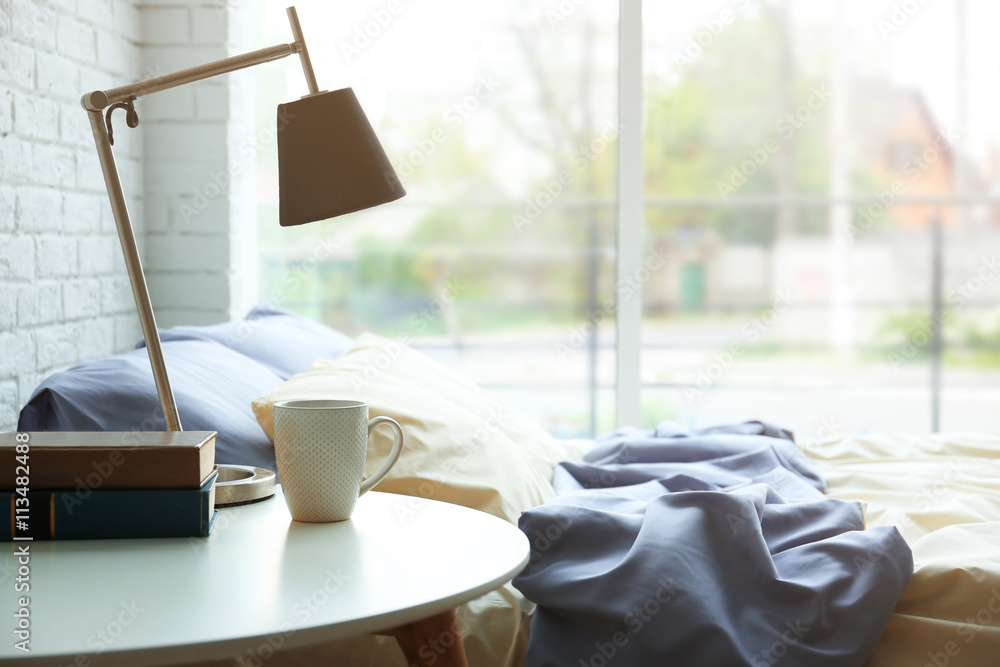 Lamp, books and cup on a side table