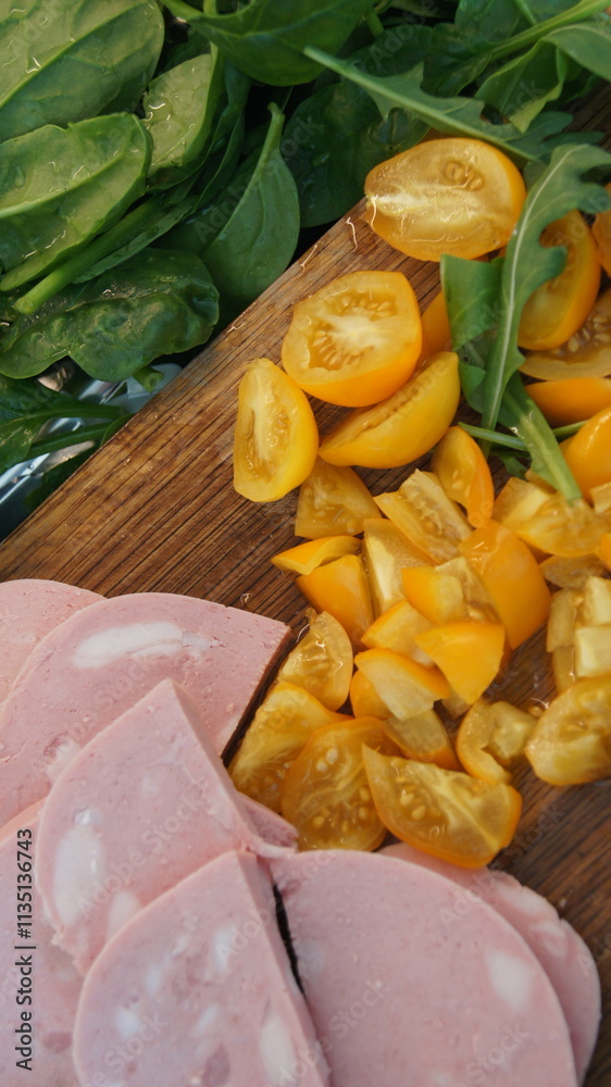 Mortadella sausage cut into pieces, yellow tomatoes cut, arugula and valerian leaves, ingredients for dinner on a wooden board, Italy