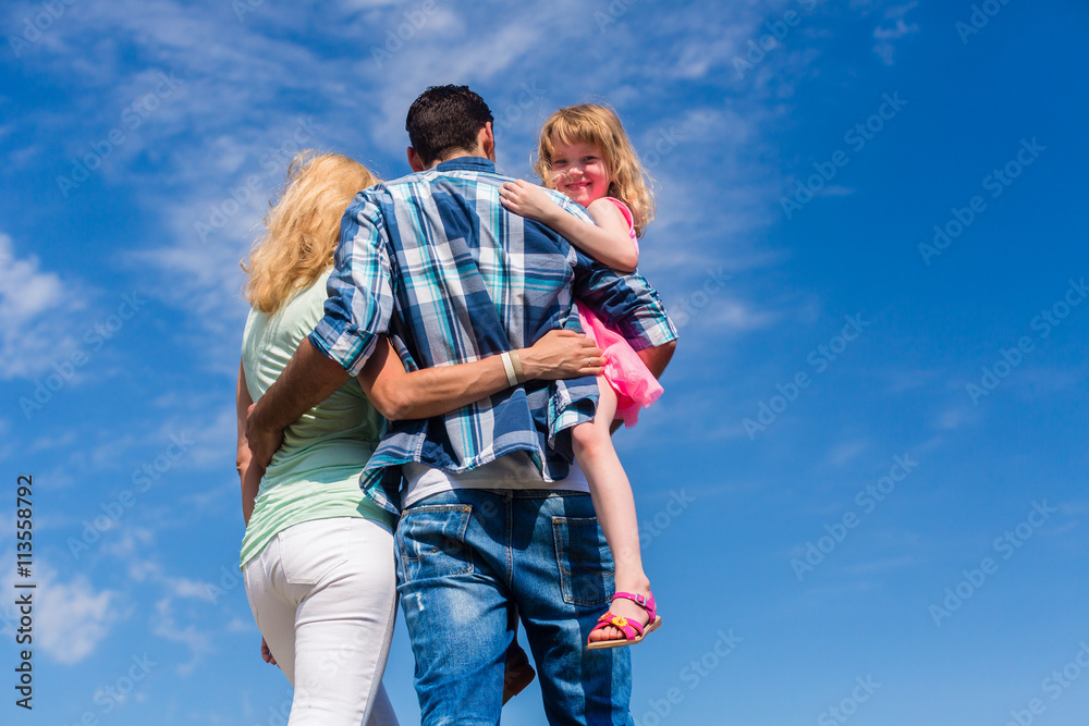 Familie, sich umarmend, Rücken zur Kamera leichte Untersicht