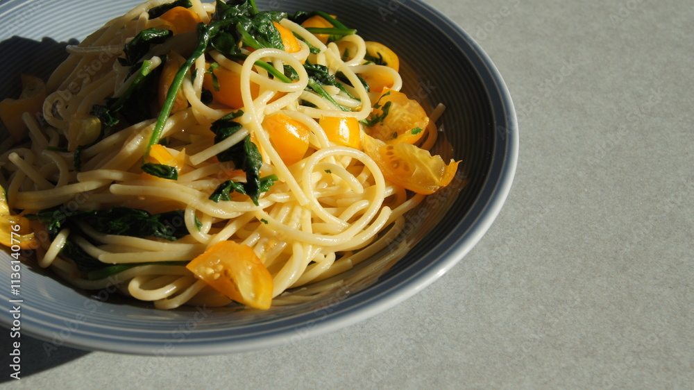 Spaghetti with yellow cherry tomatoes, with spinach, olive oil. Pasta spaghetti cooked with vegetables, on a blue plate on a gray table, lunch, first course, Italy