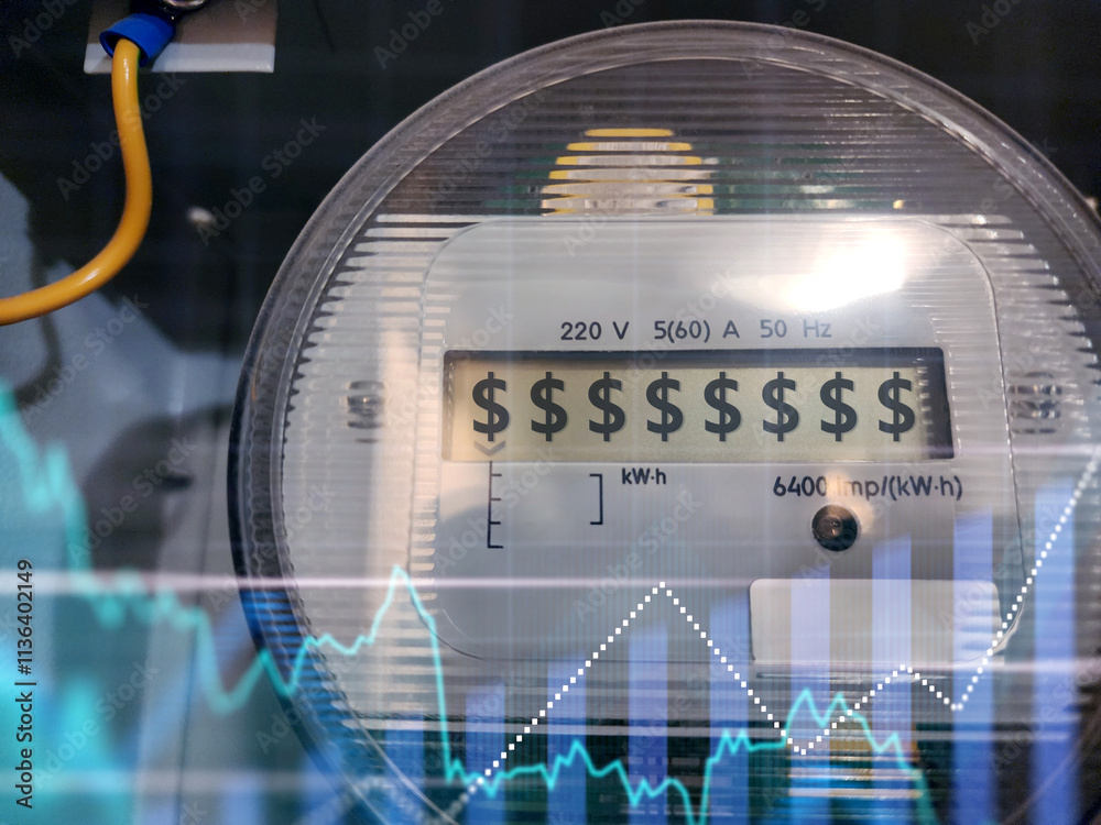 Electric counter close-up. Device for metering consumed electricity. Electricity price growth chart. Increase in cost of energy resources. Electronic counter with dollar symbols on display