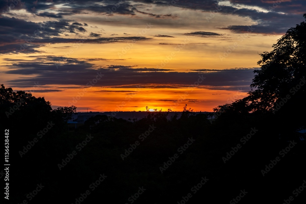 Dramatic sunrise with intense natural orange lights and idyllic dramatic scenery