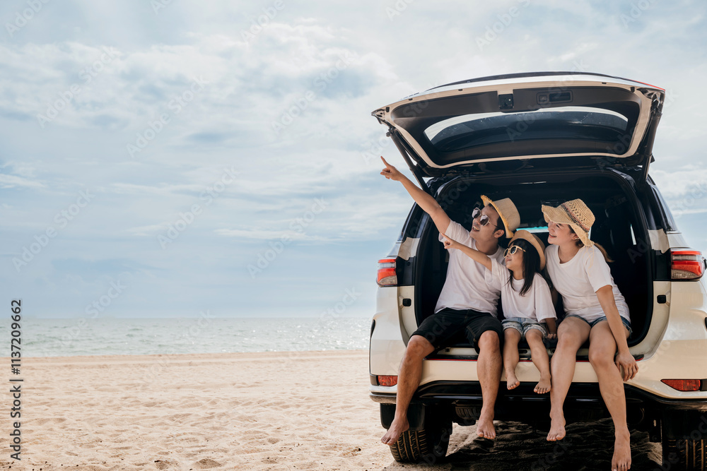Tourism Day. Dad, mom and daughter enjoying road trip sitting on back car and pointing finger out blue sky, people having fun in summer vacation on beach, Family traveling in holiday at sea beach